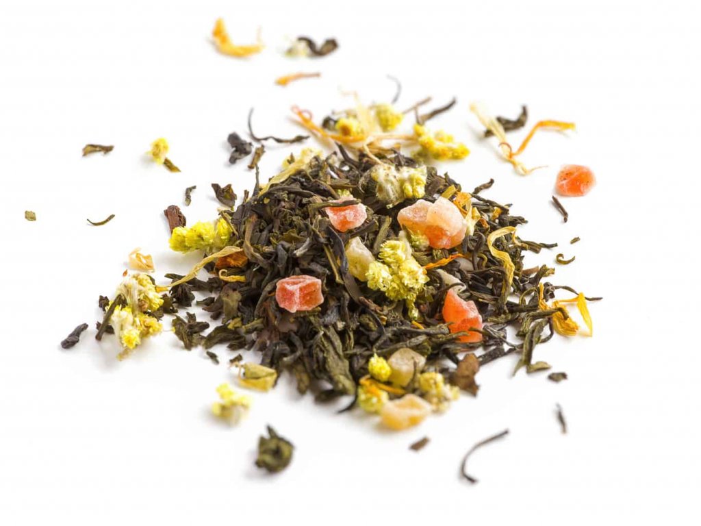 Zloženie: Zelený čaj (89 %), kúsky kandizovaného manga, kúsky kandizovanej papáje, kvet nechtíka,