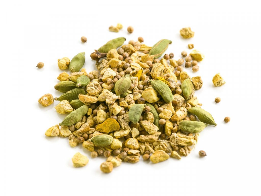 Zloženie: Koreň zázvoru, kardamón, koriander, koreň kurkumy, klinček, muškátový oriešok.