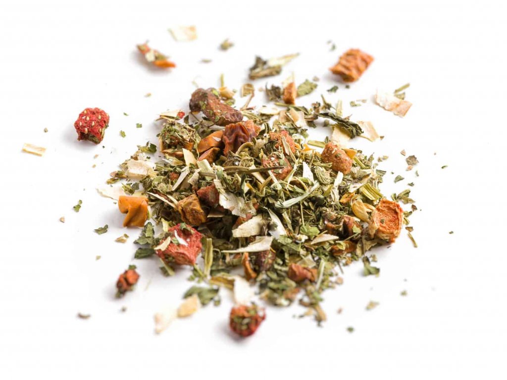 listy z ostružiny, listy čiernych ríbezlí, listy žihľavy, kúsky jahôd(5 %), mäta pieporná (5 %), aróma.