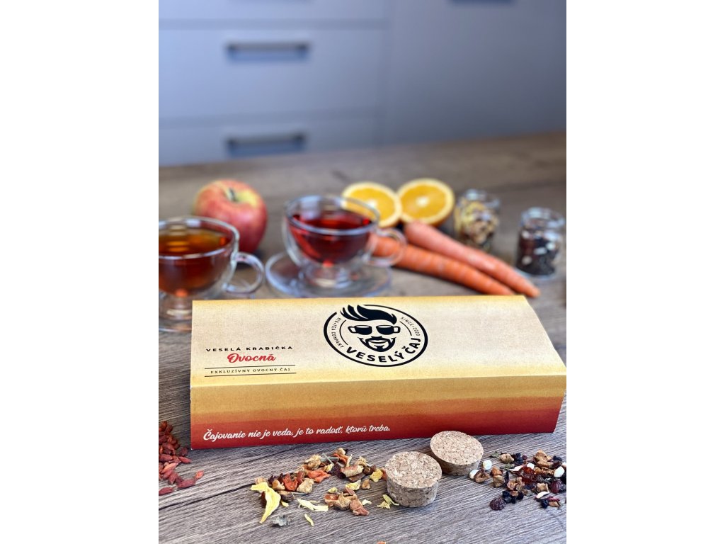 Obsahuje ovocné čaje zabalené v sklenenom poháriku s korkovým uzáverom: