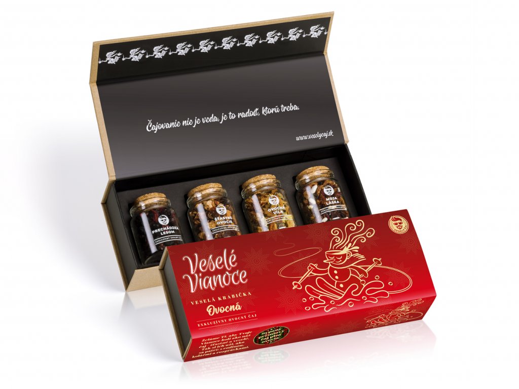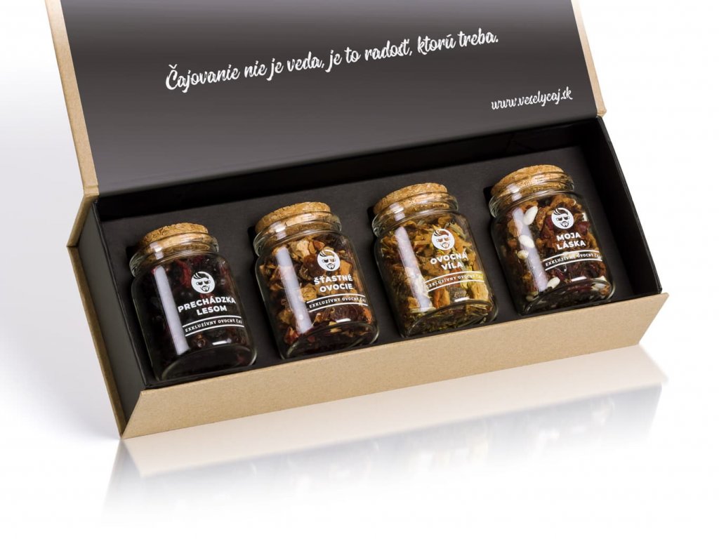 Obsahuje ovocné čaje zabalené v sklenenom poháriku s korkovým uzáverom: