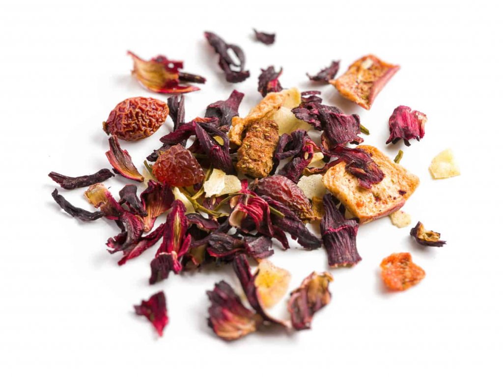 Zloženie: Ibištek, šípkové šupky, kandizované kúsky manga, kandizované kúsky ananásu, mrkvové kúsky, kandizované kúsky mandarínky, kokosové lupienky, kúsky jabĺk, biely čaj Anji, kúsky jahody, aróma.