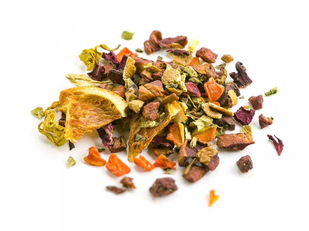 Zloženie: Kúsky jablka, mrkvy, cvikly, pomaranča a pomarančovej kôry, bazalka, prírodná aróma, kvety šafránu planého (požlt), kvety slnečnice a ibišteka, listy moringy a stévie.