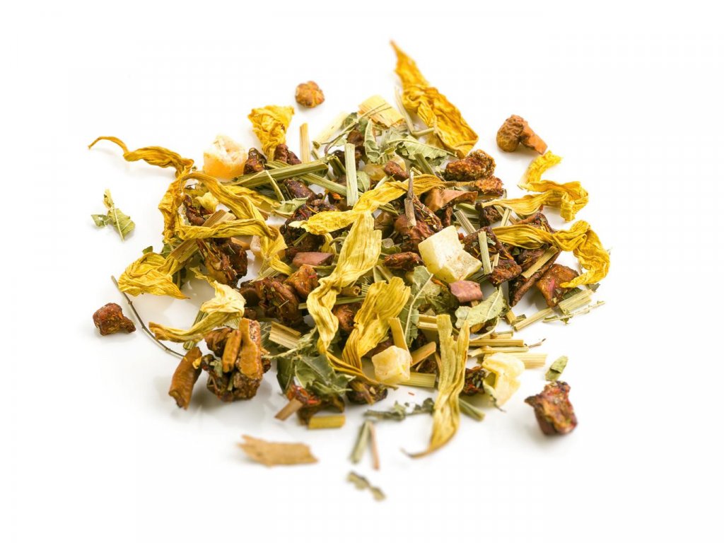 Zloženie: Kúsky jablka, kandizovaná papája, citrónová tráva, aróma, železník lekársky, kúsky žeruchy, kvety slnečnice a šafránu plavého (požlt), kúsky vanilky.